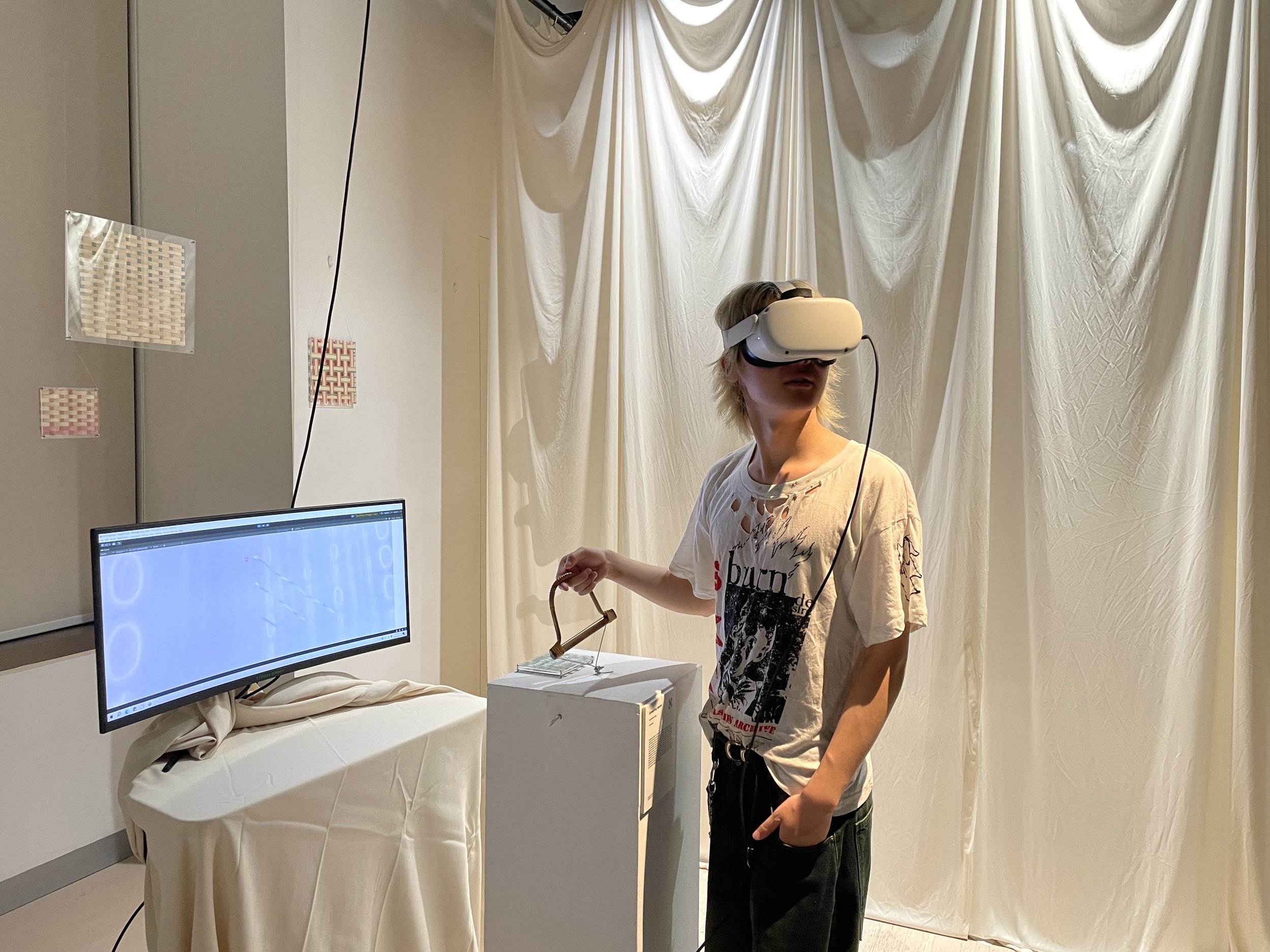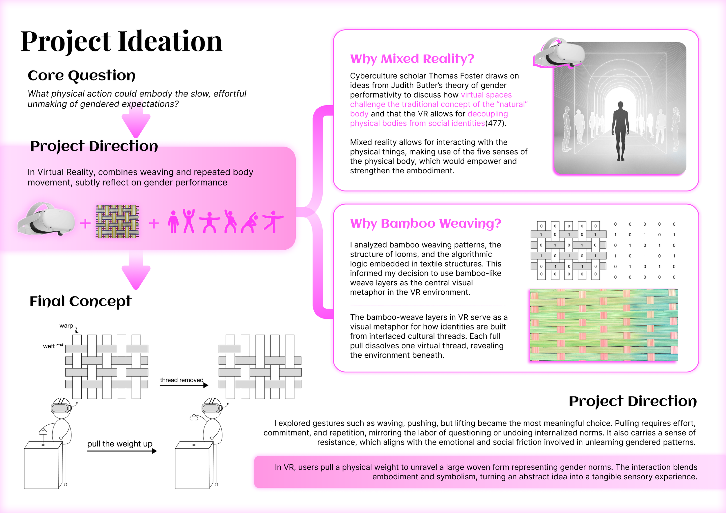 Unweaving Gender is an immersive VR installation where users physically pull a weight to unravel woven threads representing gender norms. Through embodied interaction, the project invites reflection on how gender roles are constructed and dissolved through repeated actions.